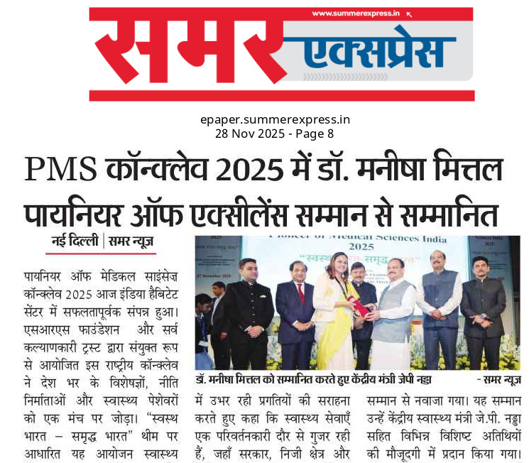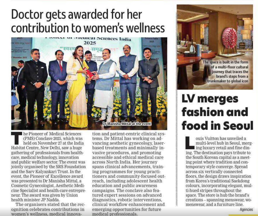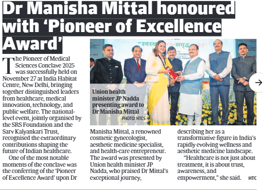 Hindustan Times covered Dr. Manisha Mittal’s “Pioneer of Excellence Award,” highlighting her contribution to science-led skincare and women’s wellness.